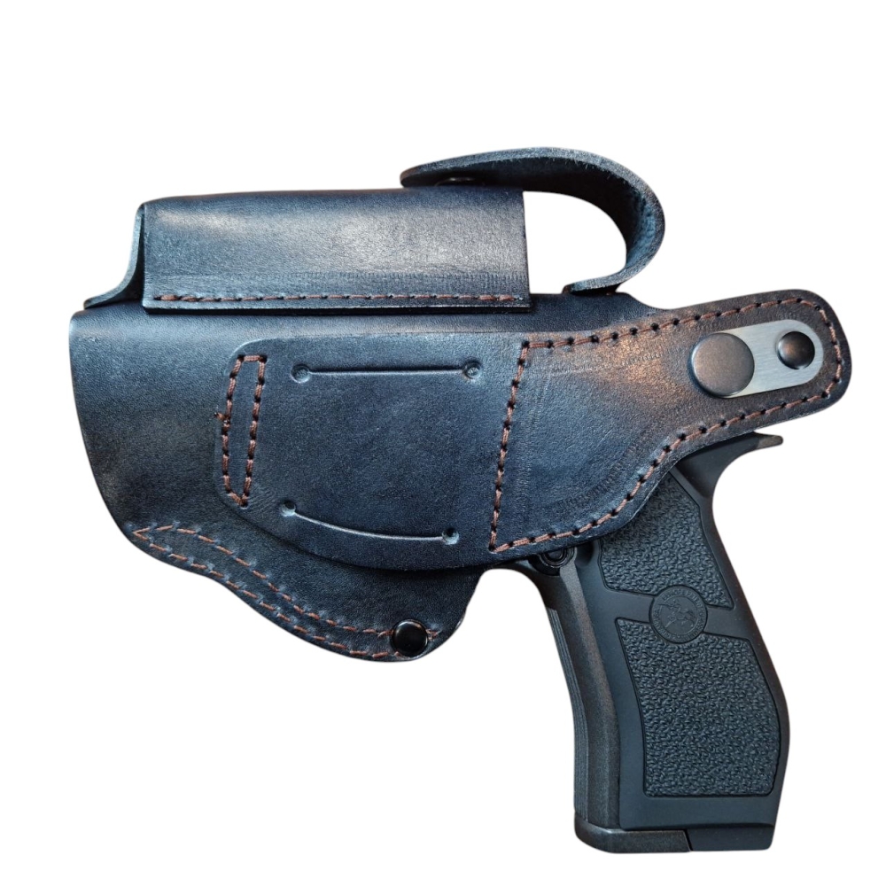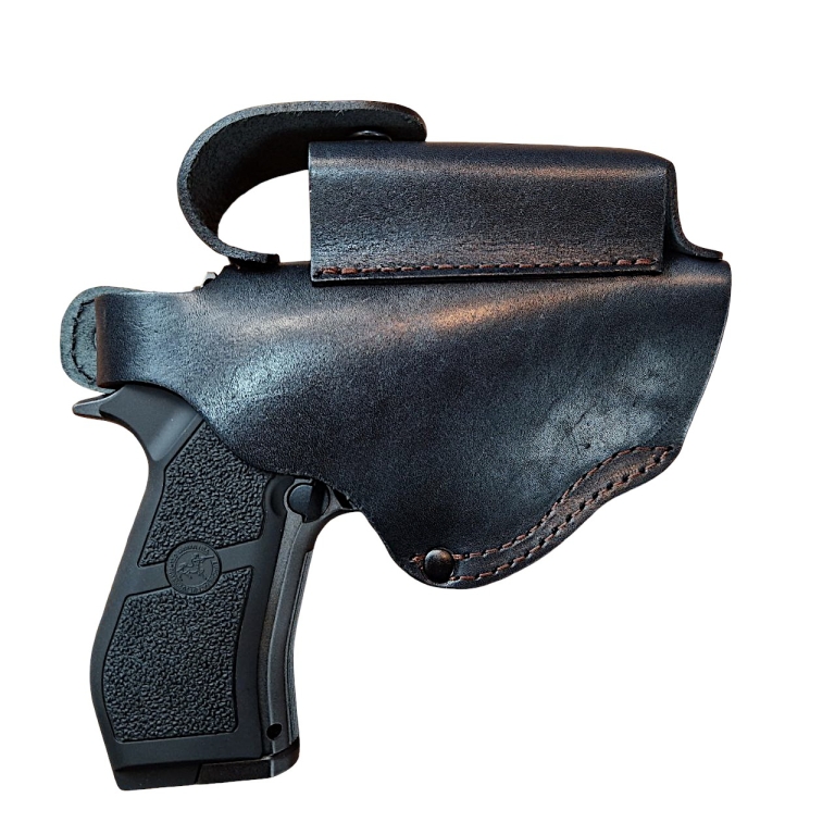 Якісна кобура поясна під пістолет із доп.місцем під магазин. Матеріал – пресована формована шкіра.