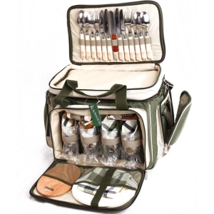У спеціальних кишенях і відсіках компактно розташовані столові прібори.Не забули вкласти в пікніковий набір і обробну дошку, хлібний ніж, відкривачку. Тканинні серветки і скатертину зіграють свою роль в сервіровці столу на природі.