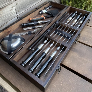 І що може бути краще, ніж набір, який також є витвором мистецтва? Кейс ручної роботи виготовлений з натурального дерева жорстких порід, і тому є не лише елегантним аксесуаром для зберігання та транспортування, але й додає нотку вишуканості та розкоші у вашій кухні чи на пікніку.