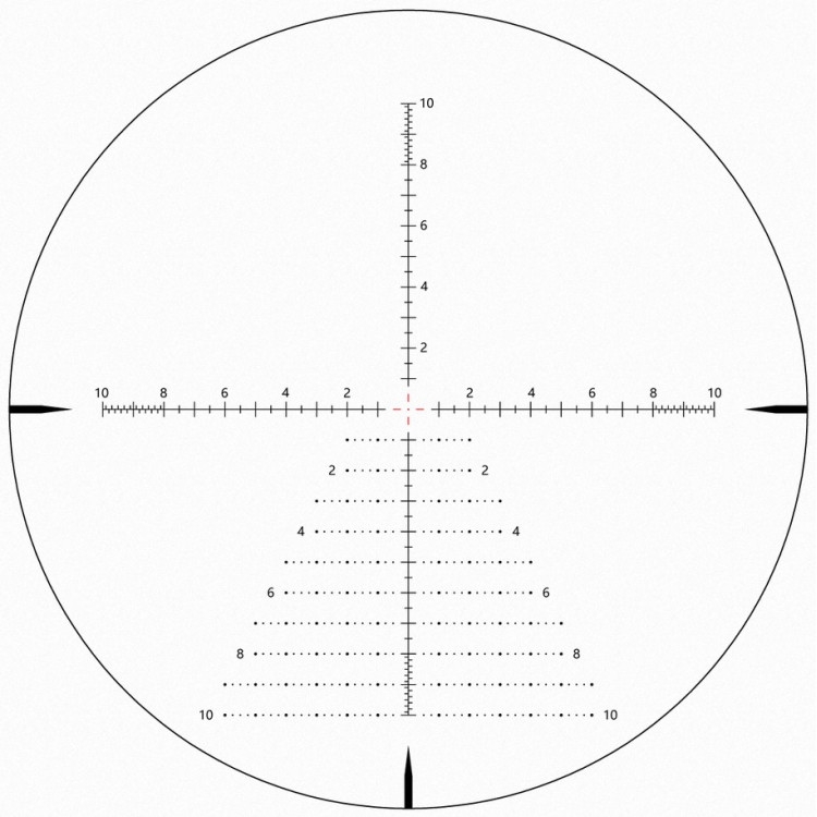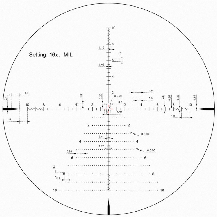 Прицільна сітка: Сітка розташована у другій фокальній площині (SFP), що означає, що її розмір не змінюється при зміні збільшення. Це забезпечує постійну точність по всьому діапазоні кратності. На кратності 16х приціл дозволяє правильно вимірювати дистанцію до об'єктів, розмір яких відомий. Сітка VTA-6 у MIL полегшує прорахунок завдяки метричній системі, а також дозволяє робити постріли «виносом» завдяки деревоподібній структурі.