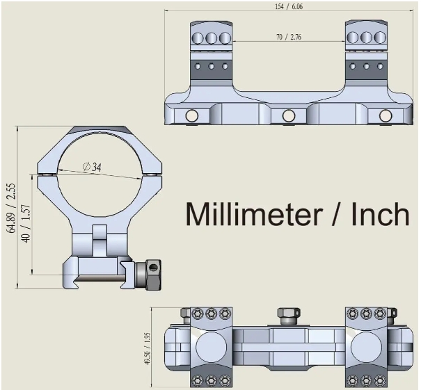 Моноблок призначений для прицілів із діаметром центальної труби 34 мм.