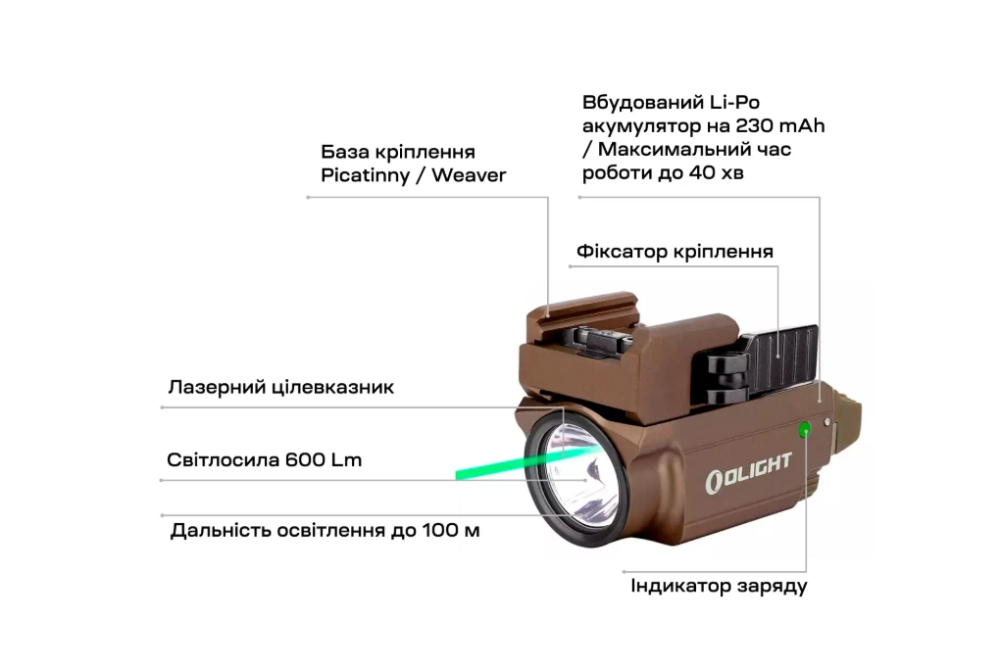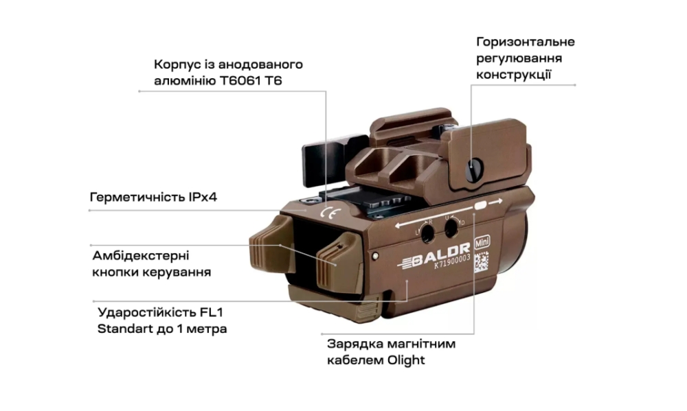Olight Baldr Mini — новий підствольний ліхтар, що поєднує компактність, малу вагу й функціональність моделей Baldr Pro та PL-Mini 2. Має потужний світлодіод High Performance Cool White LED і зелений лазерний цілевказівник, розташований безпосередньо над діодом.