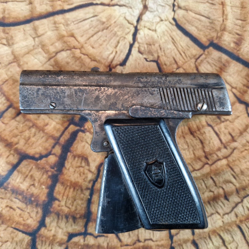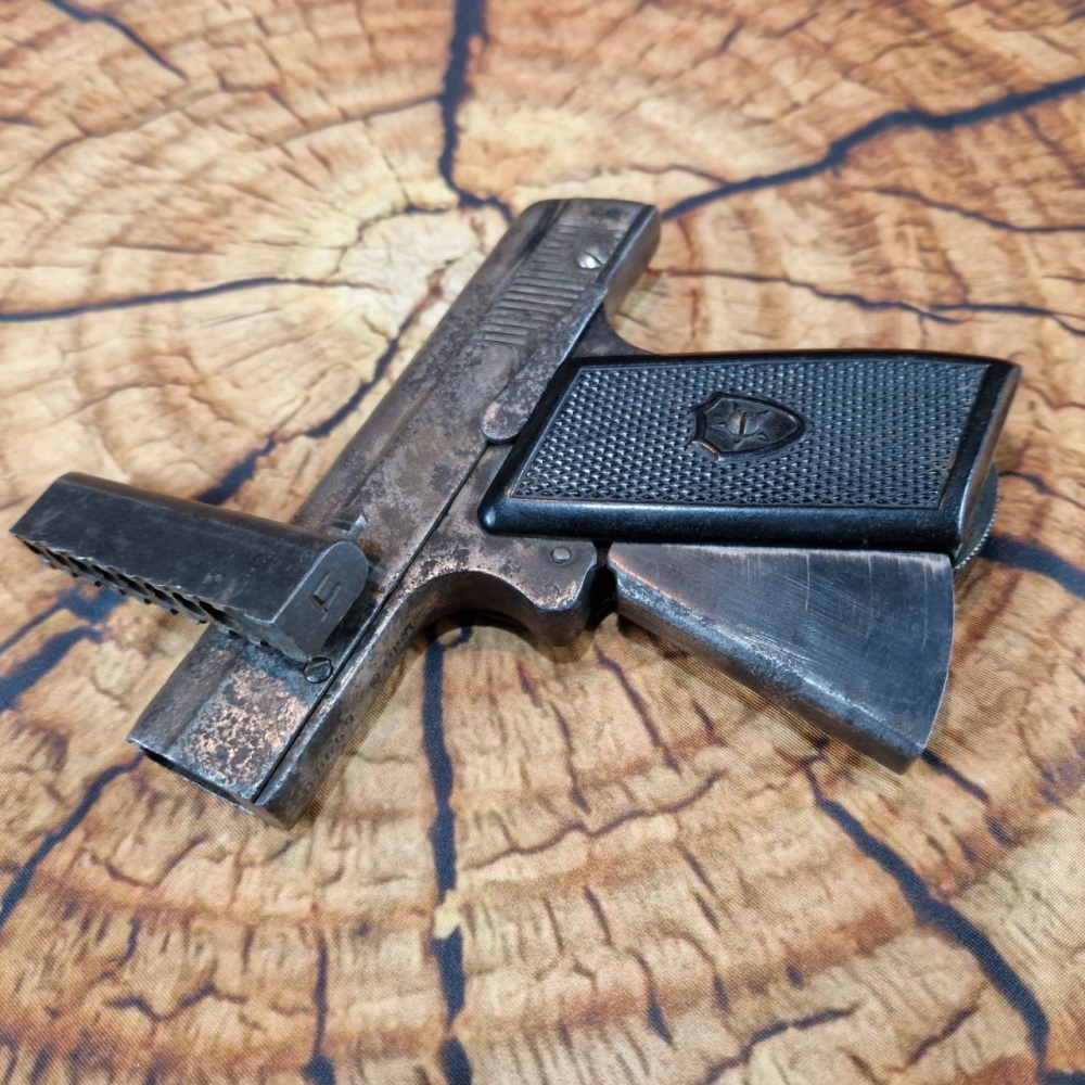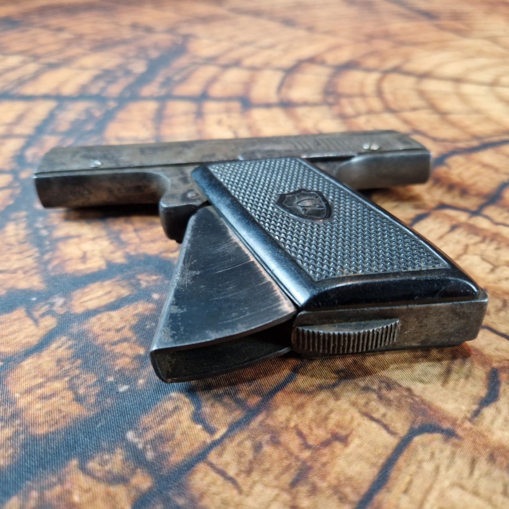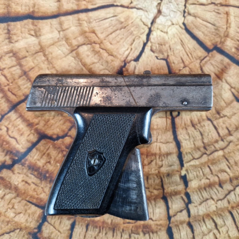 Магазин пістолета вставляється у ствол через дуло. Магазин на вісім гнізд, до яких вставляються патрони. Патрони вставляють вертикально, таким чином, що постріл відбувається вгору. Стовбур пістолета має прямокутну форму. Обойма суцільнометалева.