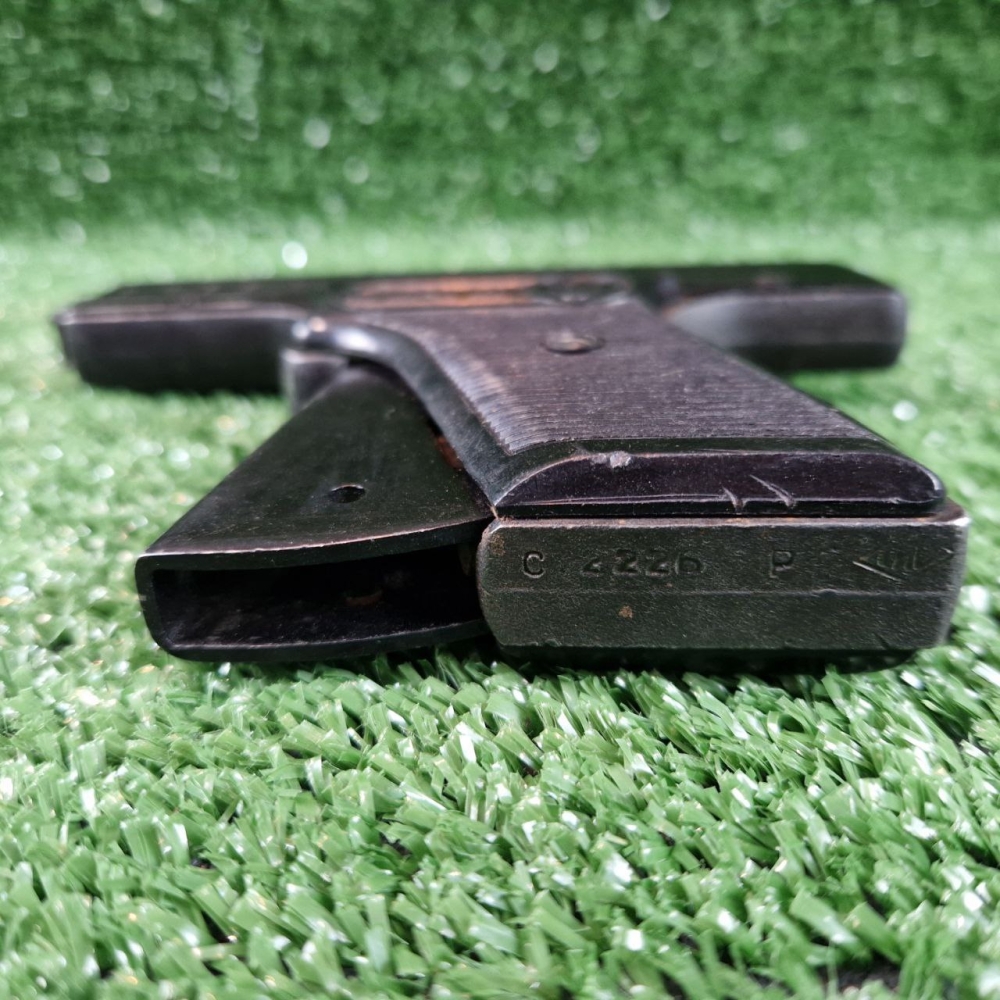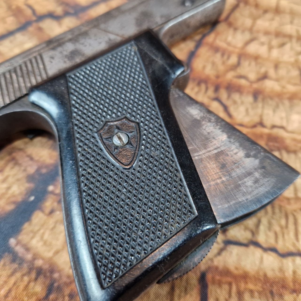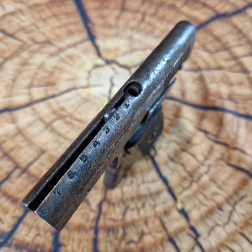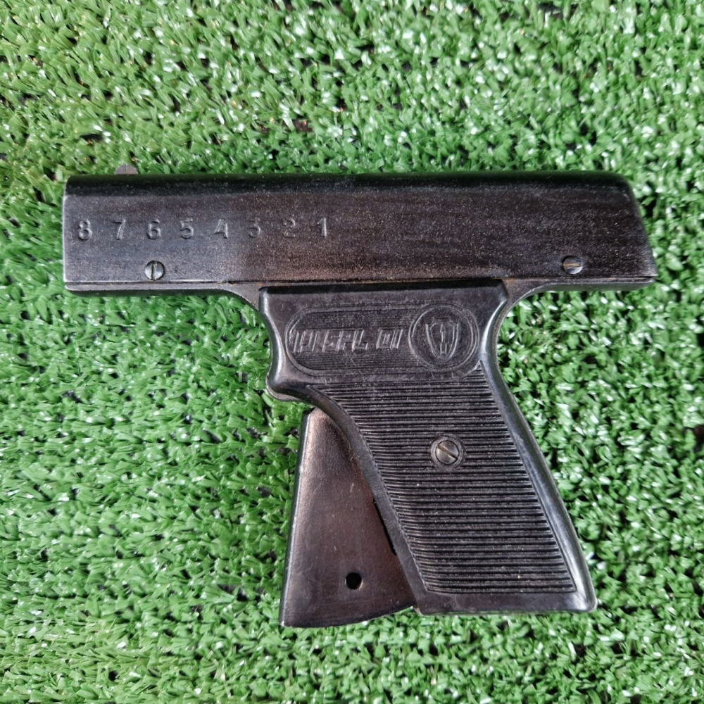 Магазин пістолета вставляється у ствол через дуло. Магазин на вісім гнізд, до яких вставляються патрони. Патрони вставляють вертикально, таким чином, що постріл відбувається вгору. Стовбур пістолета має прямокутну форму. Обойма суцільнометалева.