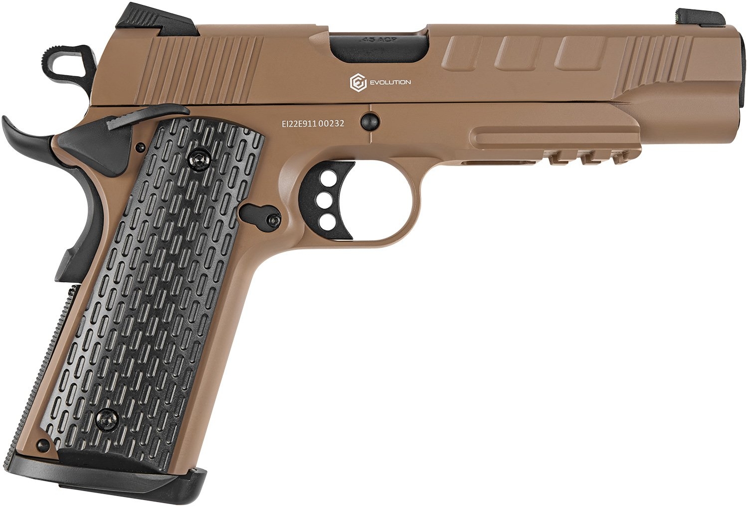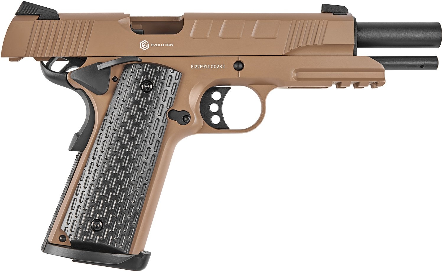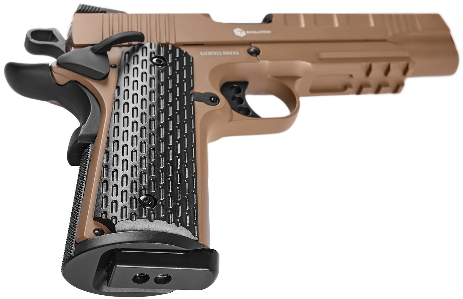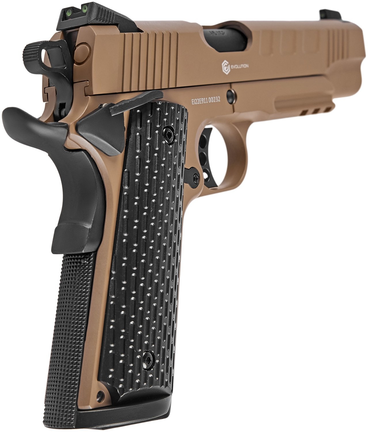 Серія E911 вирізняється вдосконаленими елементами: прицільними пристосуваннями з високою видимістю, збільшеними органами керування та насічками для зручного перезаряджання. Увага до деталей робить ці пістолети преміальними репліками.