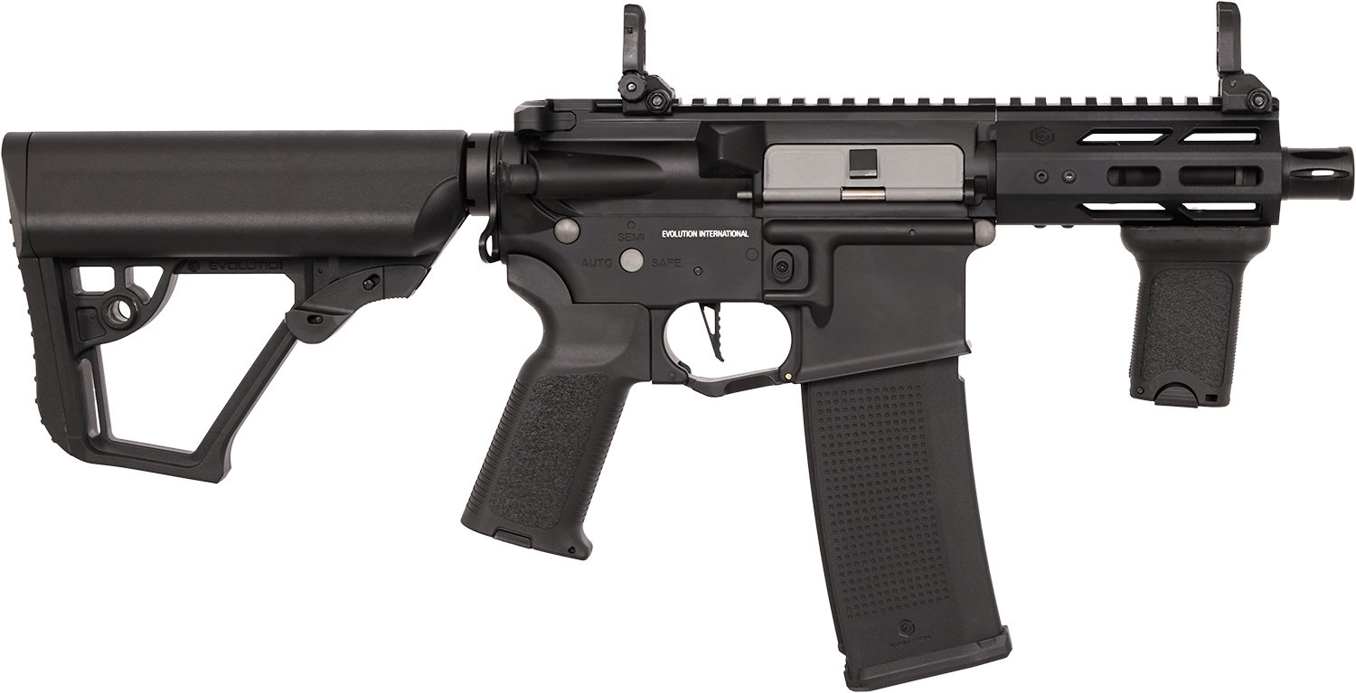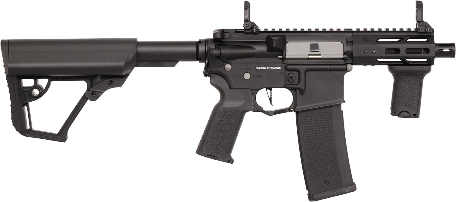Ствольна коробка та цівка виготовлені з анодованого алюмінію методом фрезерування на станках з ЧПУ, що забезпечує виняткову міцність при збереженні порівняно невеликої ваги. Пістолетне руків’я дозволяє обслуговувати мотор без інструментів. Лазерне маркування, сталеві антабки, інтегровані складані прицільні пристосування та підсилена внутрішня конструкція підвищують надійність і зручність використання.