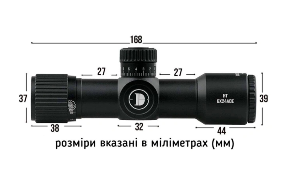 Ключовою особливістю моделі HT 6x24 AOE є її надкомпактний розмір — всього 168 мм, що робить приціл зручним та легким у встановленні та використанні.