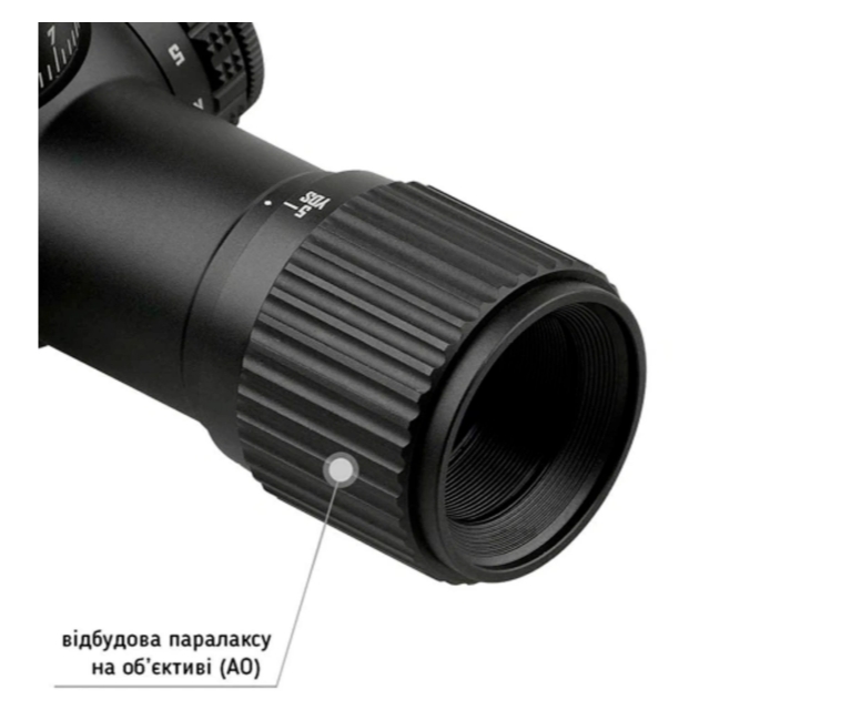 Система налаштувань включає регульований паралакс (AO) у діапазоні від 5 ярдів до нескінченності, тактичні барабани з діапазоном корекції 100 MOA та точністю кліку 1/4 MOA. Функція Zero-Lock запобігає випадковому збиванню налаштувань, а врахування обертів барабанів спрощує роботу з прицілом.