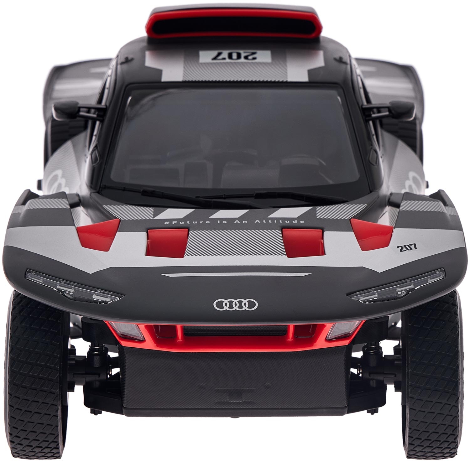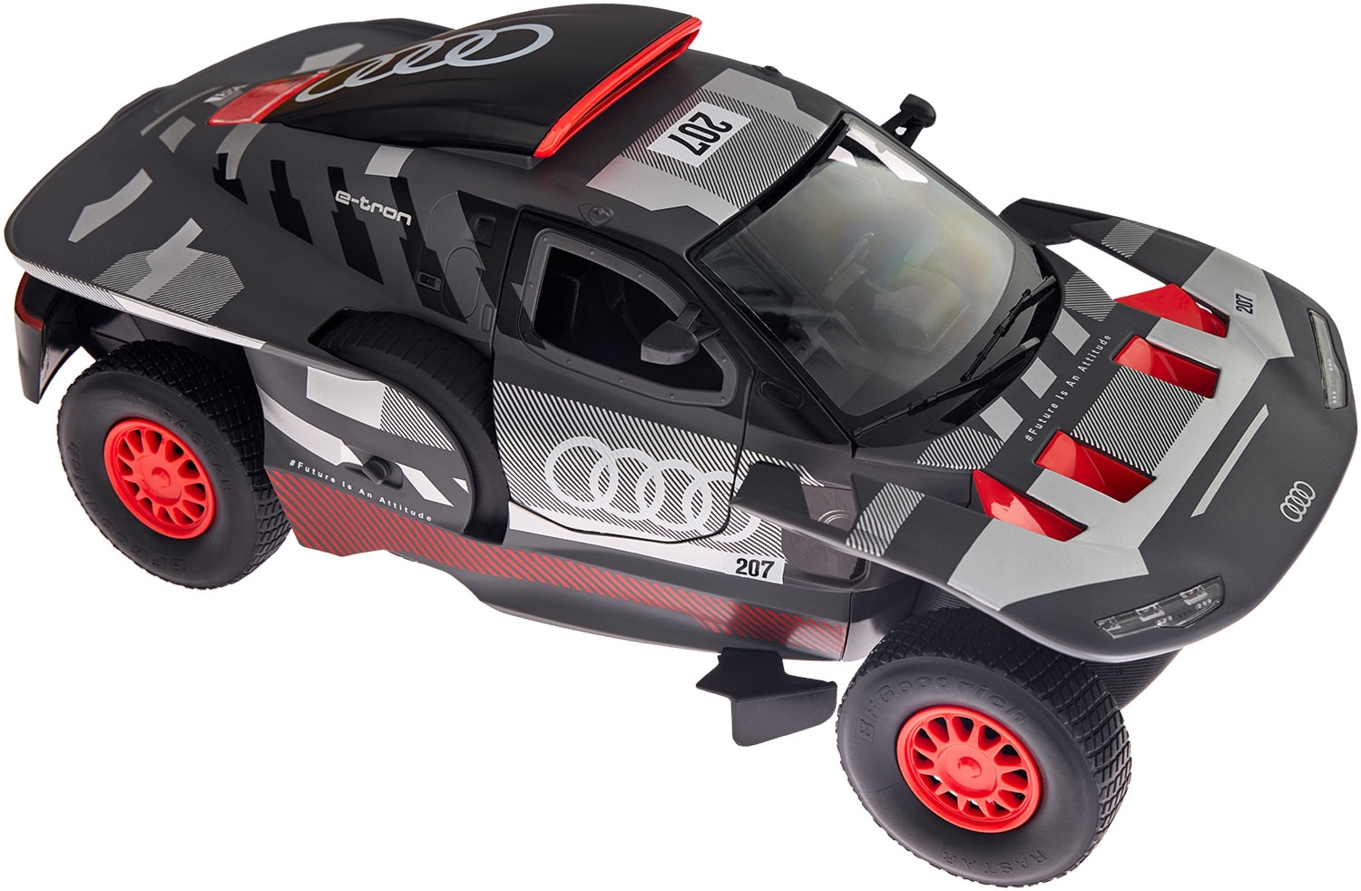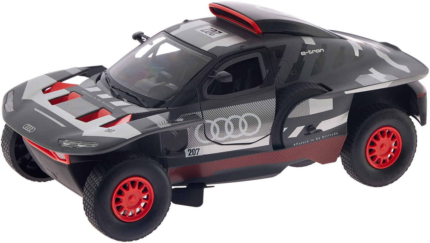 Произведите атмосферу легендарного ралли Dakar с радиоуправляемой моделью Rastar – Audi RS Q e-tron E2 в масштабе 1:14. Эта серая машинка представляет собой точечную копию инновационного гибридного внедорожника, поражающего высоким уровнем детализации кузова, узором дисков и реалистичными наклейками.