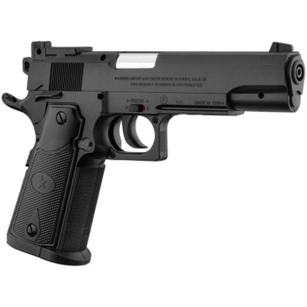 Корпус и рама выполнены из прочного пластика, вес пистолета всего 615 граммов. Затвор неподвижный — типичное решение для бюджетных CO₂-моделей, зато рычаг затворной задержки, предохранители и курок выглядят почти как у настоящего «Кольта». Очень круто сделана имитация патронника и внутреннего ствола в зоне выброса гильз — вставка под металл смотрится шикарно.