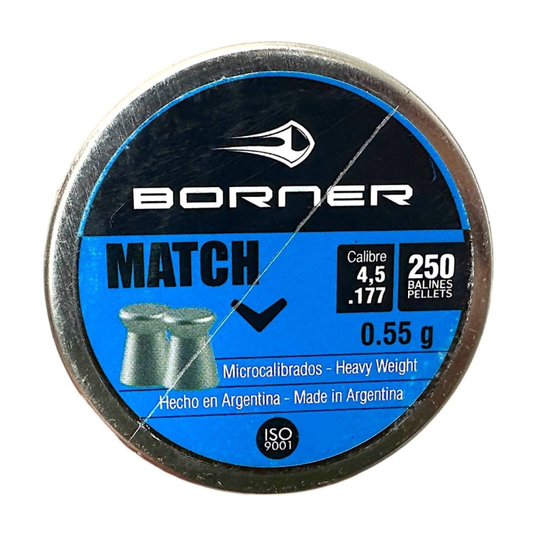 Пули Borner Match предназначены для развлекательной и спортивной стрельбы из нарезного пневматического оружия. Количество пуль в банке - 250 штук средним весом 0,58 грамм. Головная часть имеет плоскую поверхность, благодаря этому выбивается ровный круглый след в мишени, что значительно упрощает подсчет результатов.