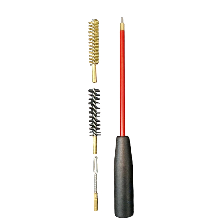 Практичный набор для регулярного обслуживания пистолетов 9 мм. Секционная или сборная конструкция шомпола (красный стержень с эргономичной пластиковой ручкой) обеспечивает удобную работу и транспортировку. Латунная ерш-щетка аккуратно снимает свинцовые и угольные отложения, жесткая щетка – для устойчивых загрязнений, петля позволяет продевать патчи/салфетки, а моп (ватный тампон) дает чистую полировку и нанесение защитного масла. Поставляется в прозрачном полиэтиленовом пакете с маркировкой калибра.